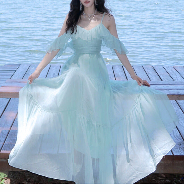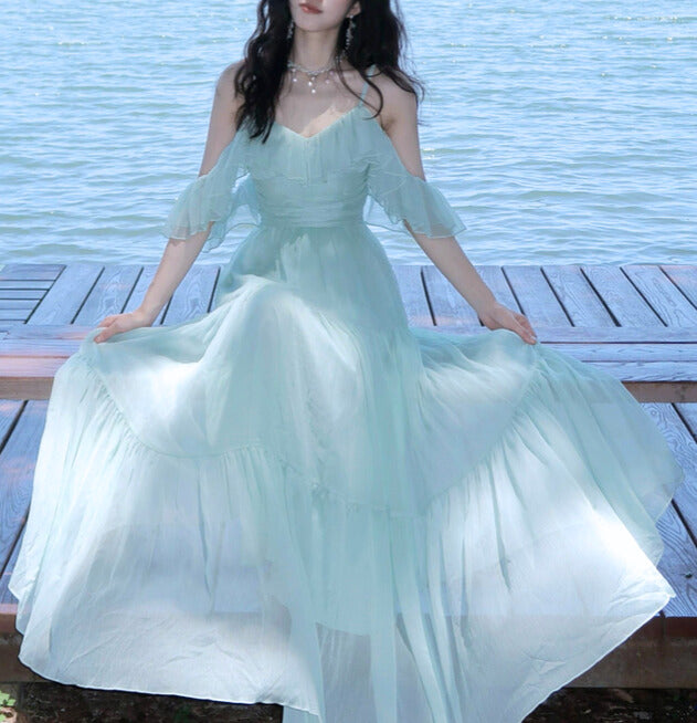静かな水辺に、そっと溶け込むようなエメラルドドレス。
