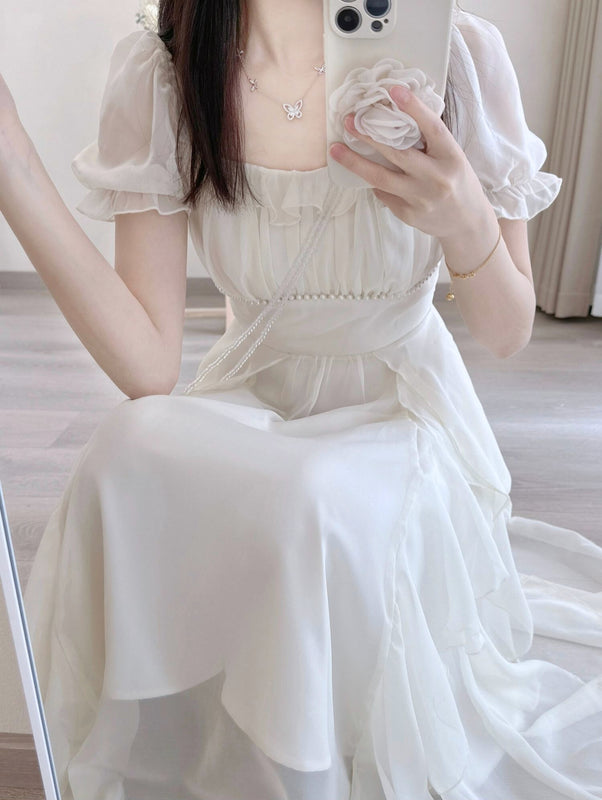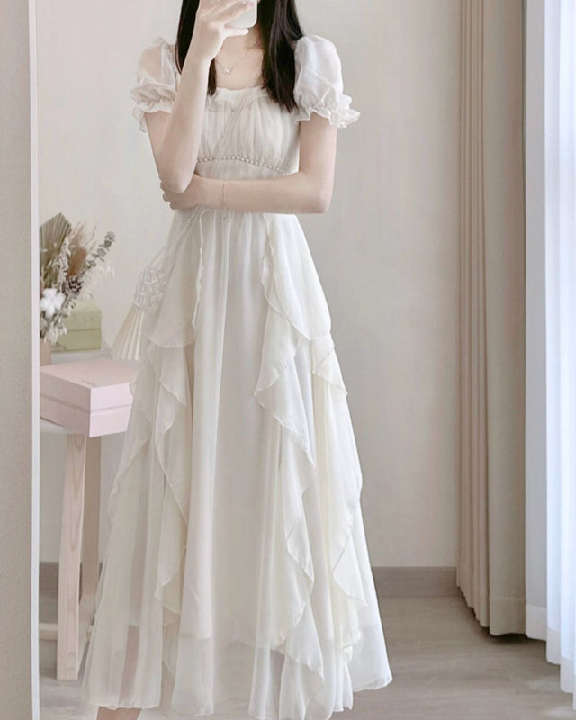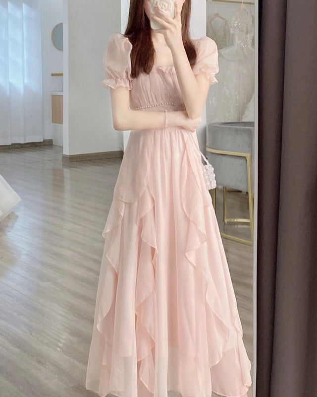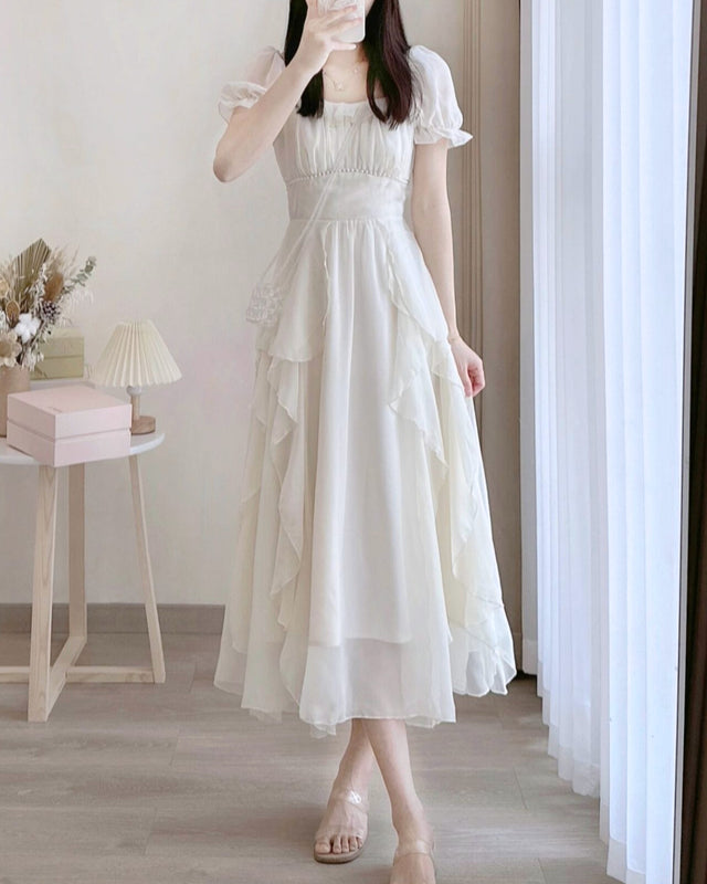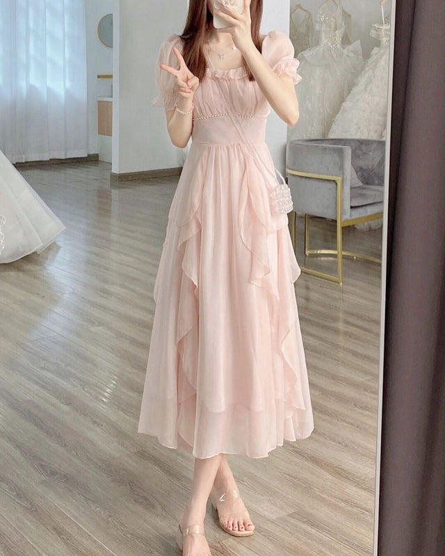 やわらかなシフォンと軽やかなフリルが重なり合い、