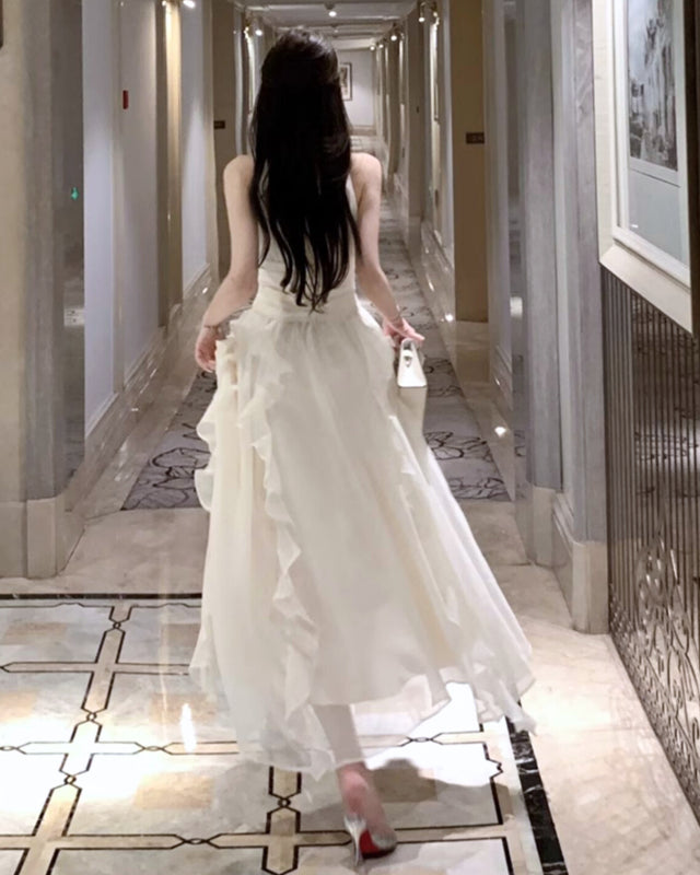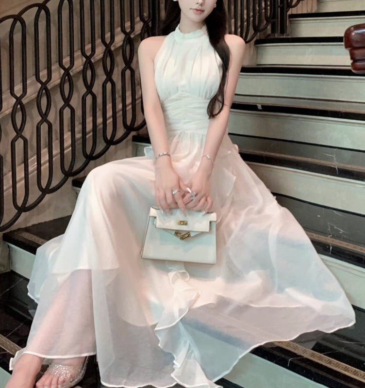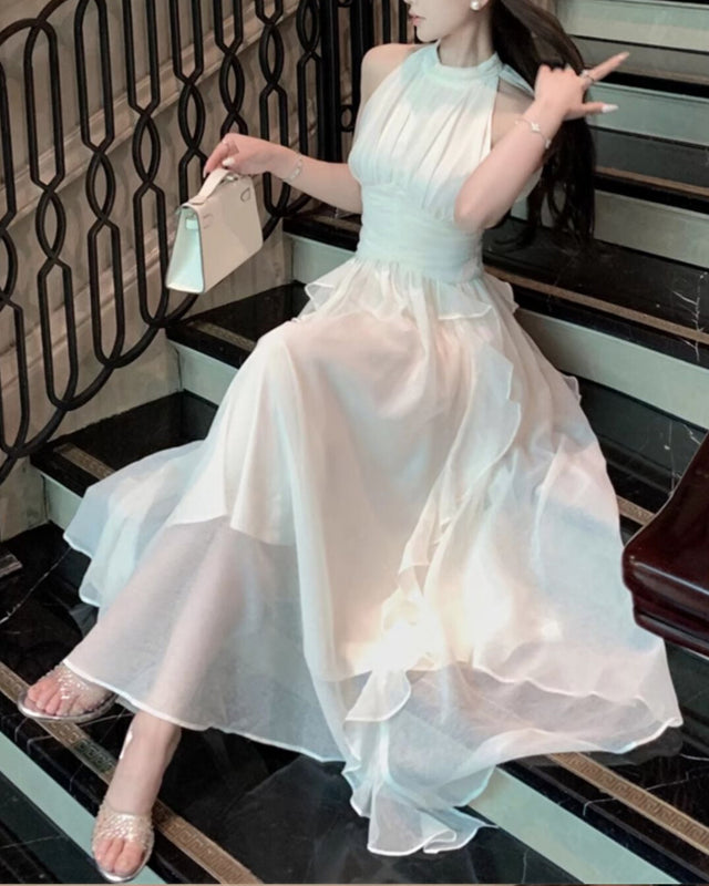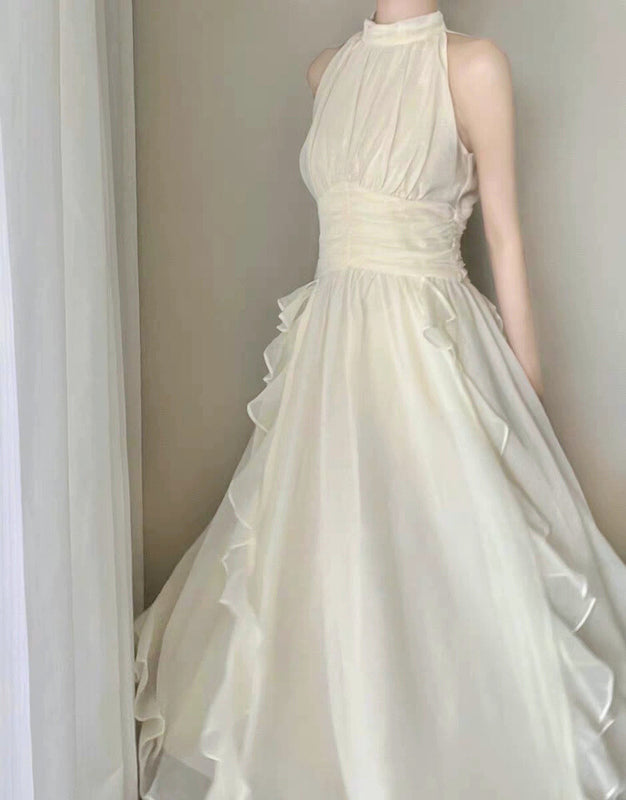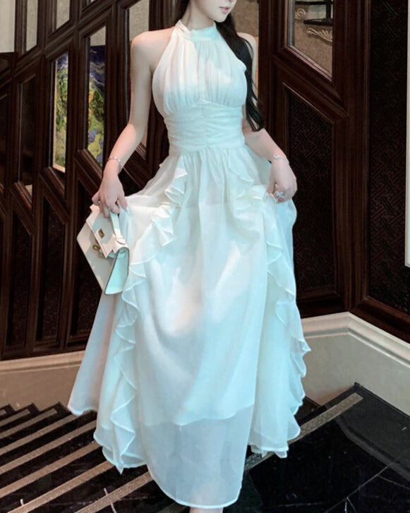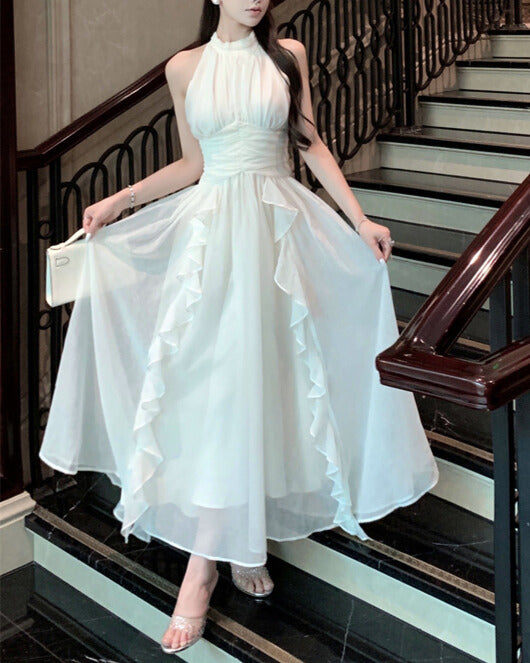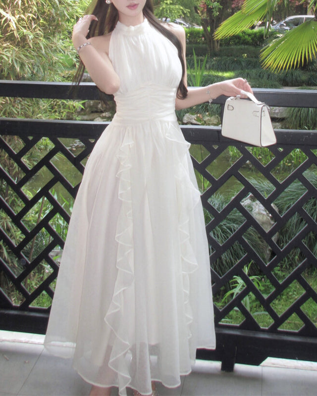 繊細な透け感と流れるようなフリルが美しい、ホルターネックのホワイトドレス。