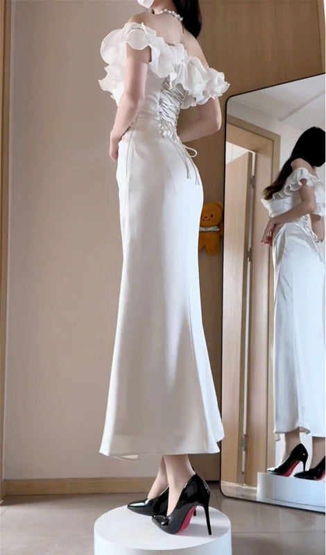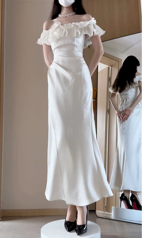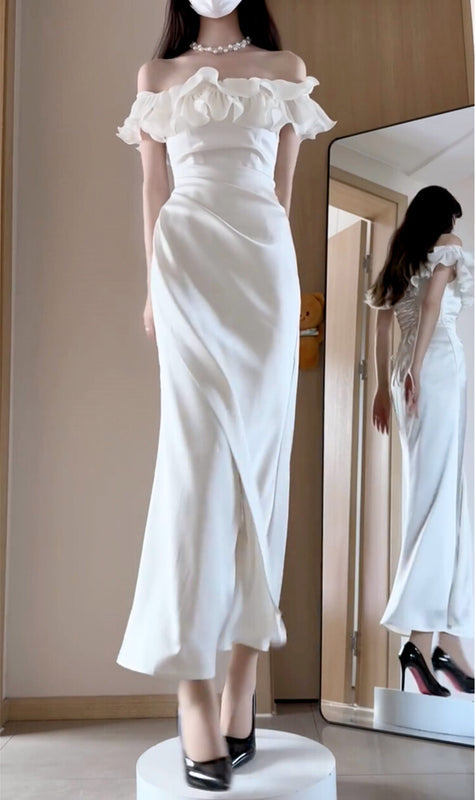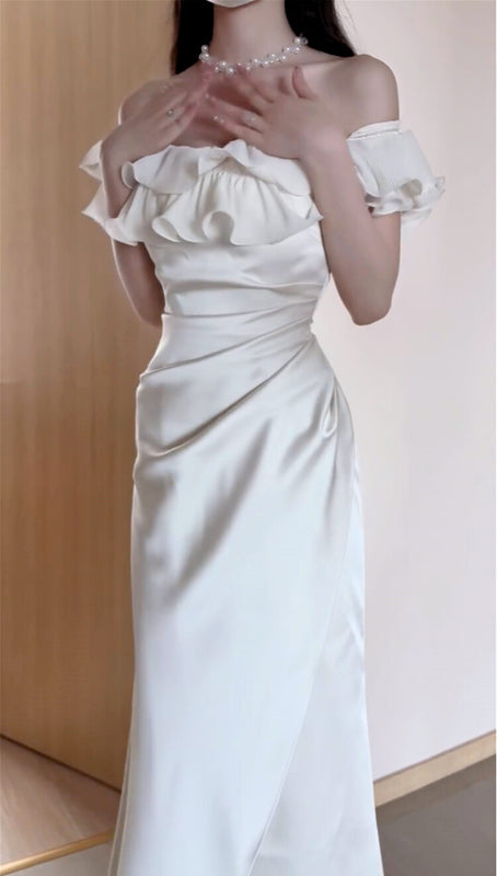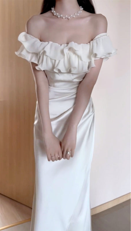 洗練された艶が静かに香る、上品オフショルダードレス。