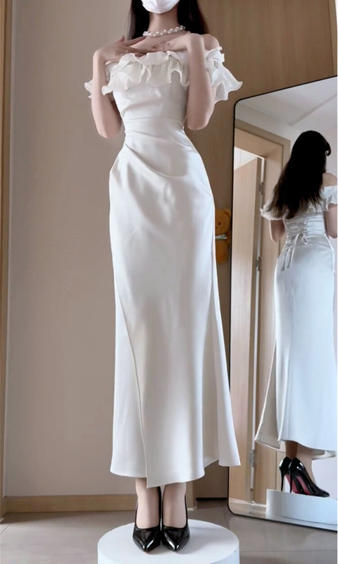 肩まわりを包み込むように広がるフリルがデコルテを美しく見せ、