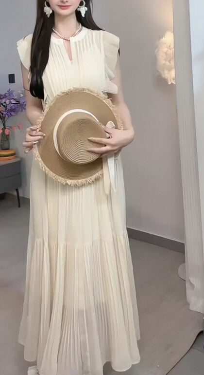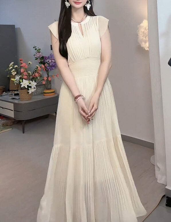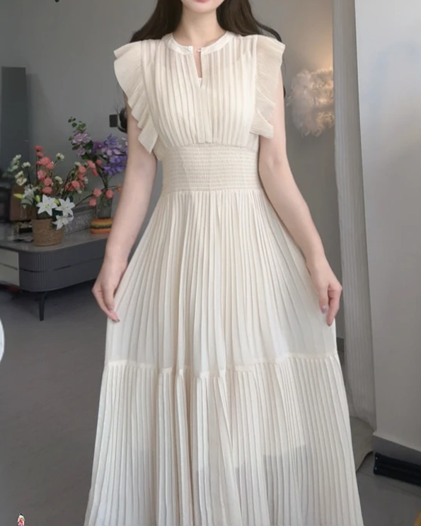 繊細なプリーツとふんわりとしたシルエットが軽やかに揺れ、しなやかな女性らしさを引き立てる一着。