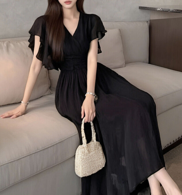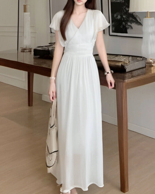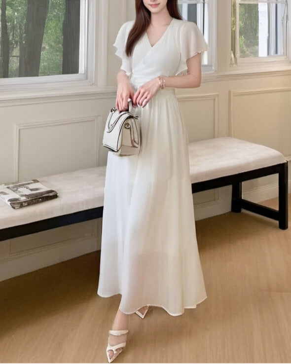 無駄を削ぎ落としたデザインに、軽やかな素材感が映えるロングワンピース。ウエストラインを美しく引き立てるシルエットと、ほんのり透け感のあるフレンチスリーブが、大人の上品さを引き出します。ランチ会や美術館デートなど、日常を少しだけ特別にしてくれる一枚です。