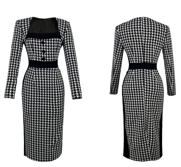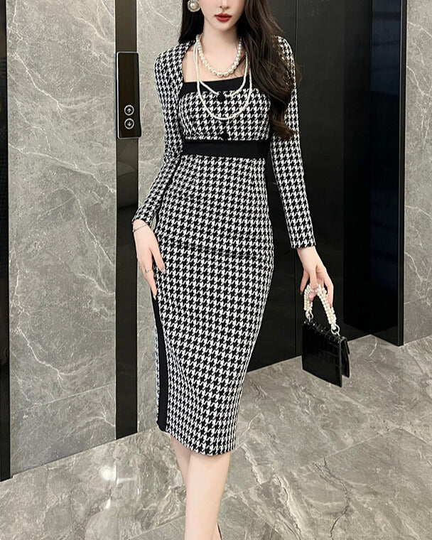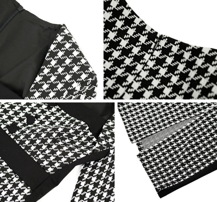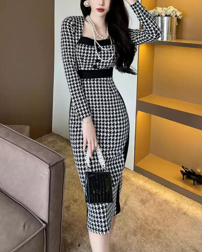 千鳥柄のクラシカルな雰囲気に、ボディラインを美しく見せるタイトシルエット。