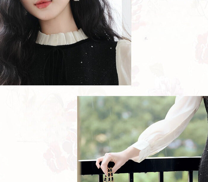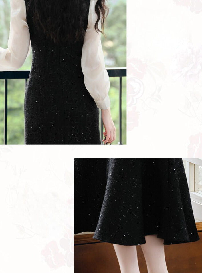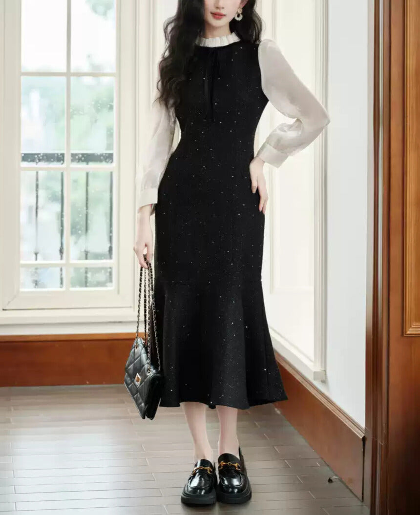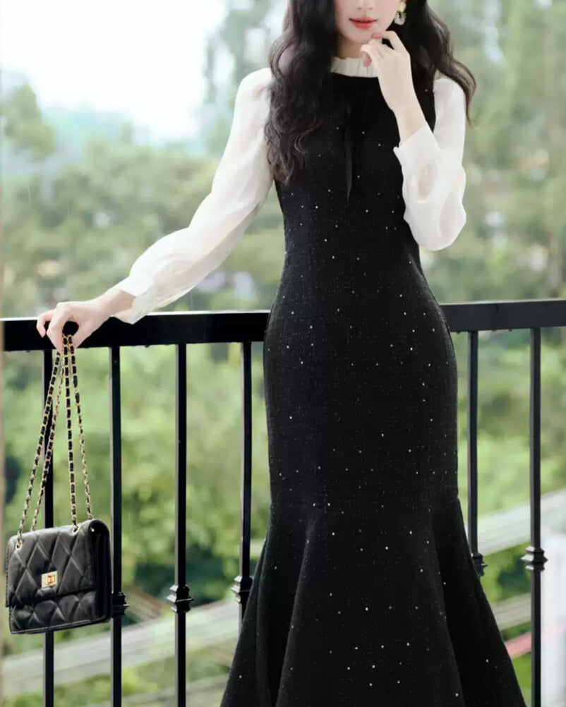 クラシカルな白ブラウス風デザインと、黒のマーメイドラインが