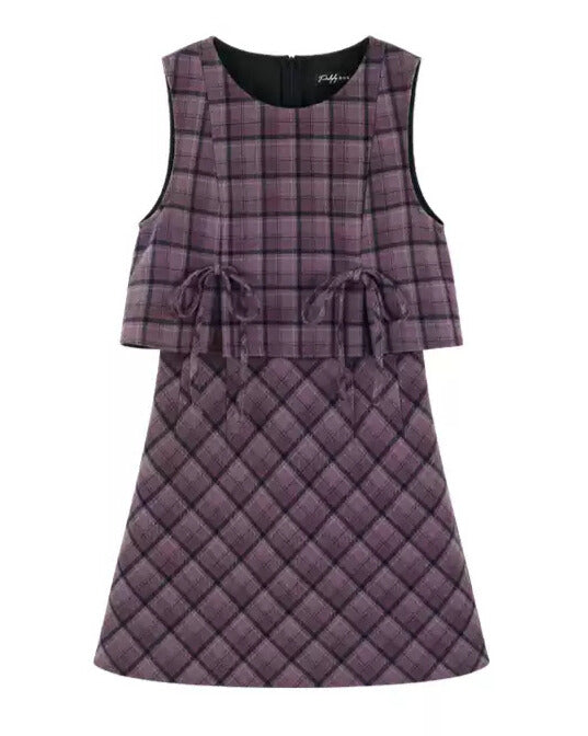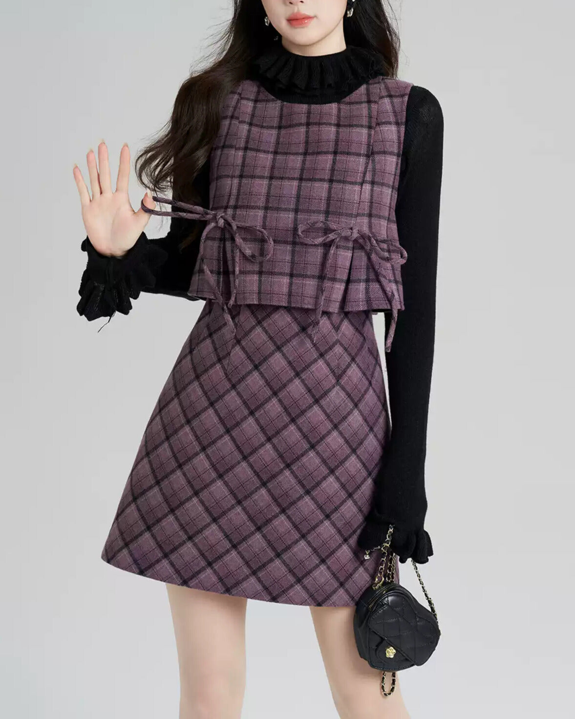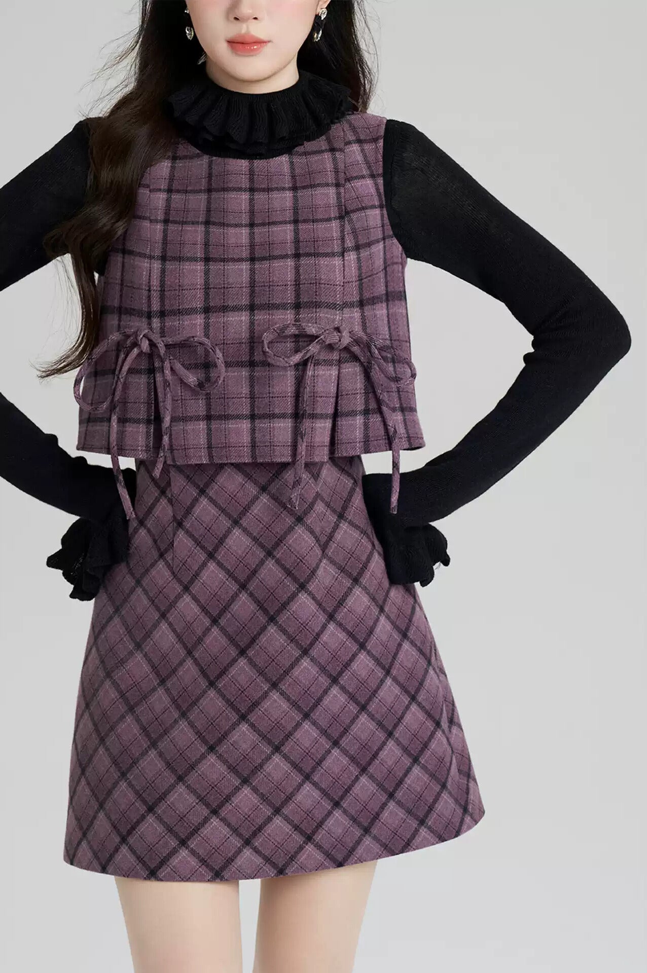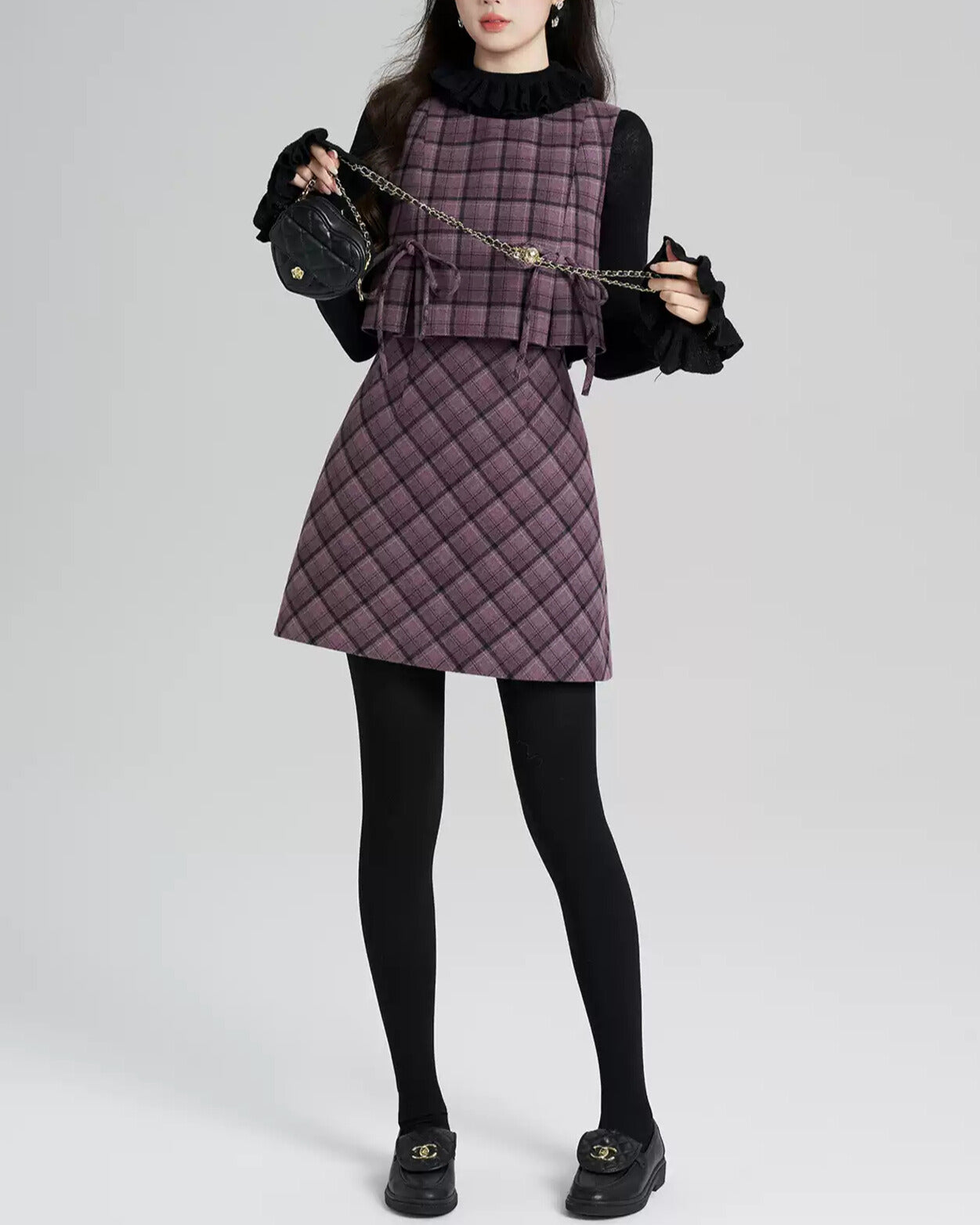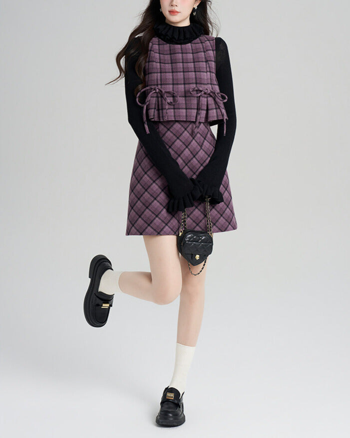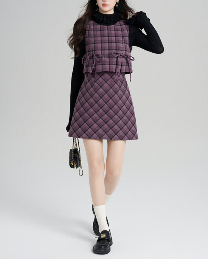 上品なパープルチェックのベスト×ミニスカートに、