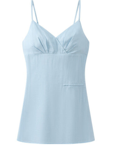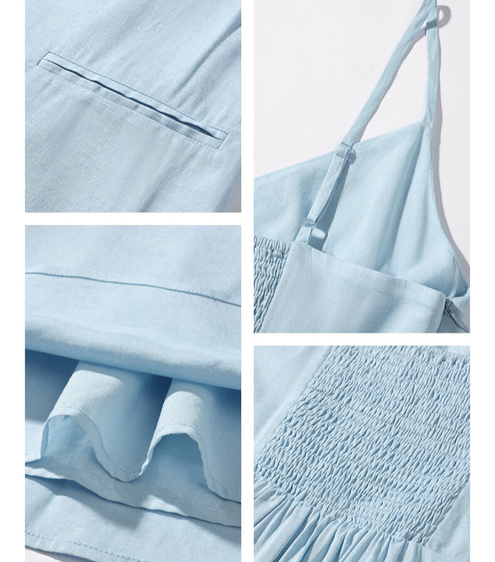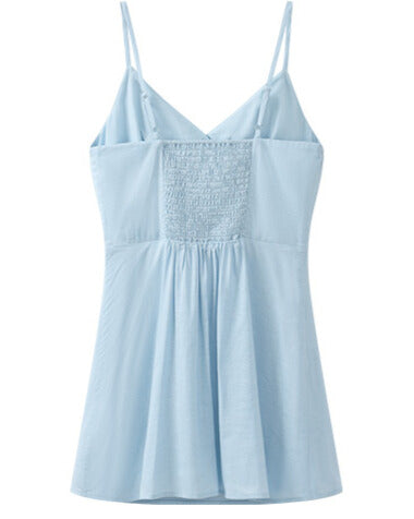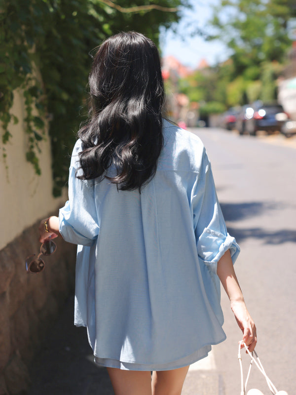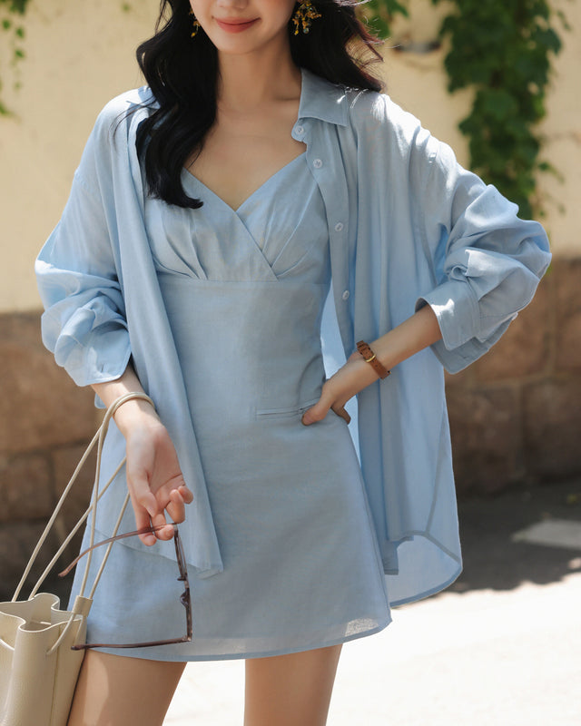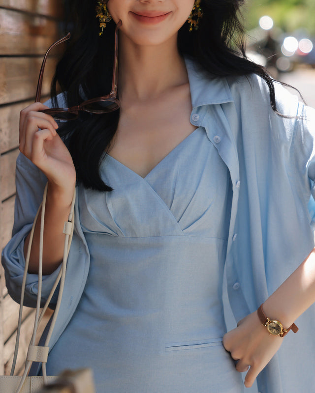 涼しげなライトブルーが目を引く、シャツ×キャミワンピの軽やかレイヤードスタイル。