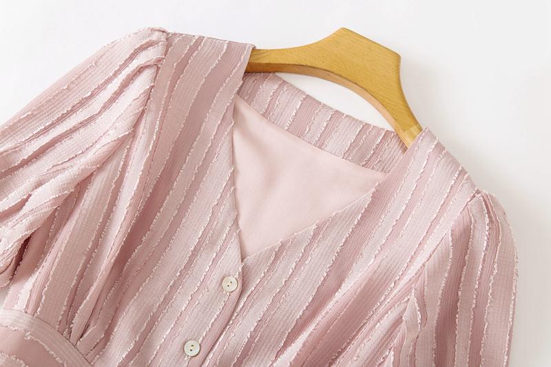 やわらかな朝日に透けるように輝くピンクのシャツワンピース。