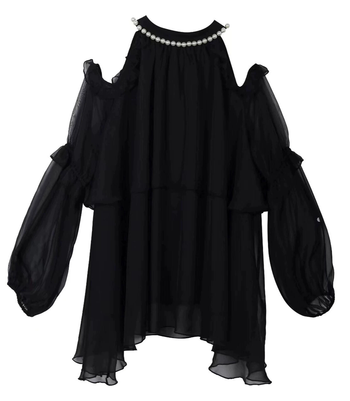 パールネックとフリルスリーブが、可憐さと上品さをバランスよく引き立てます。