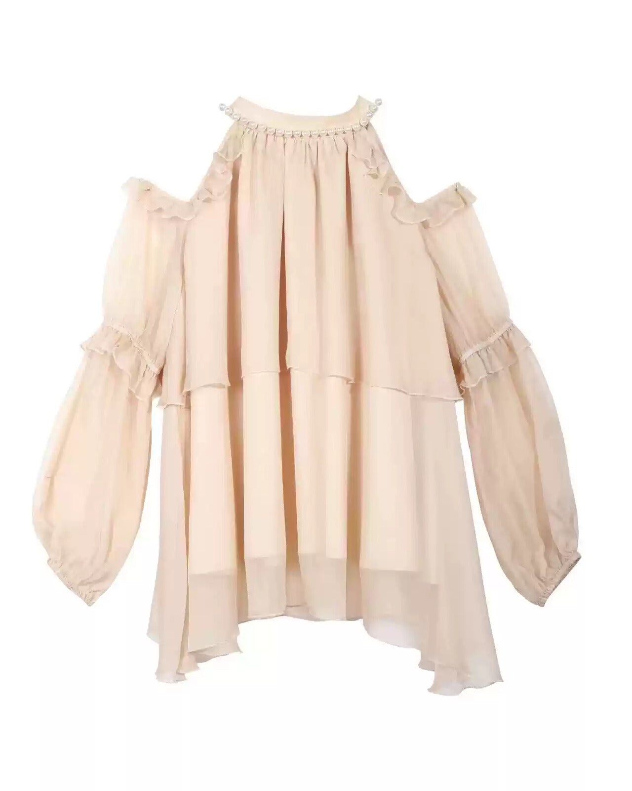軽やかなシフォンが肌をやさしく包み、歩くたびにふわりと揺れるオフショルダーワンピース。