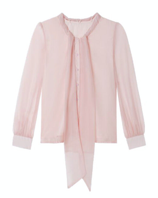 ふんわり透けるシフォンと大きなリボンが、可憐で上品な印象を引き立てるブラウス&スカートセット。