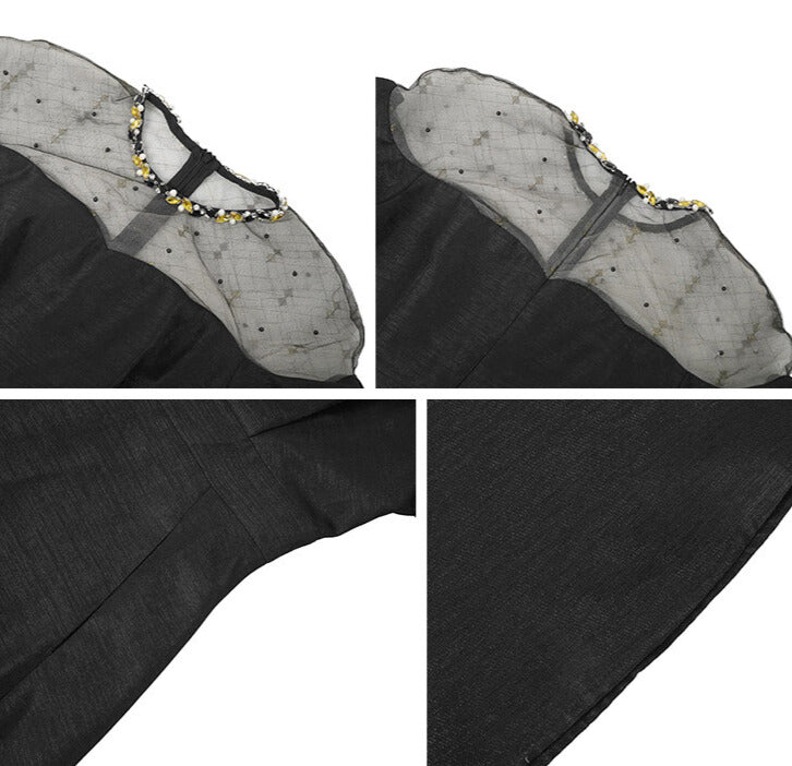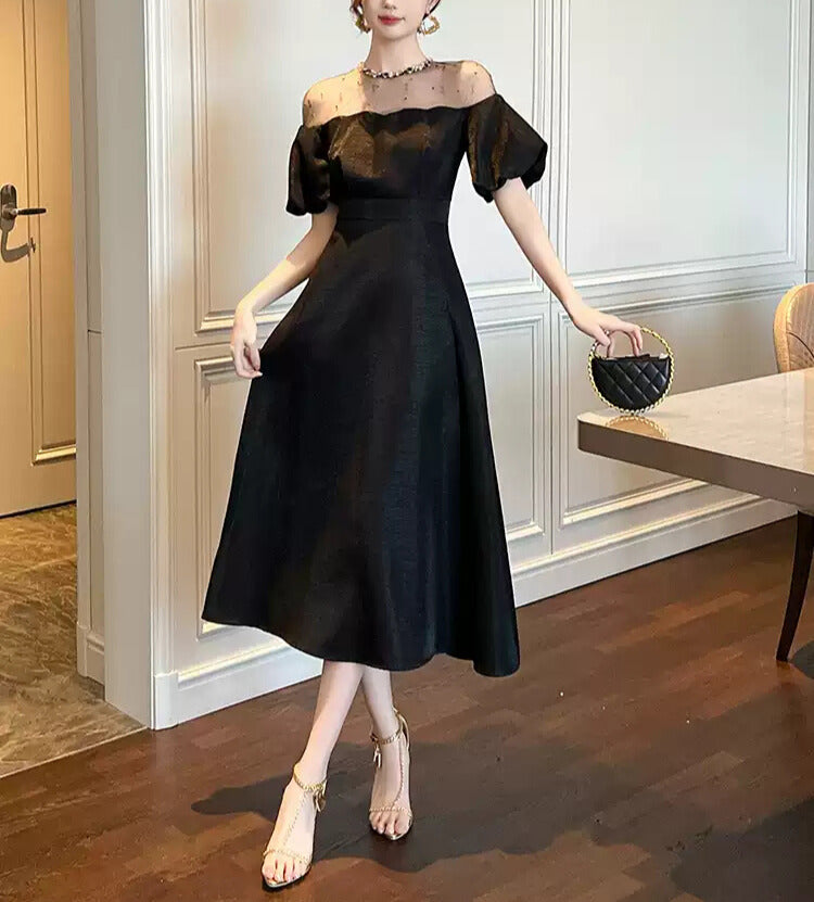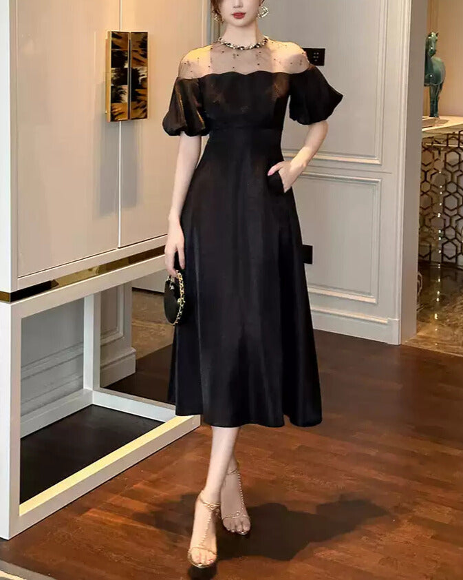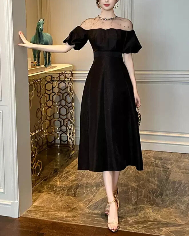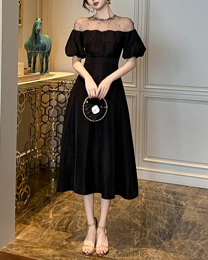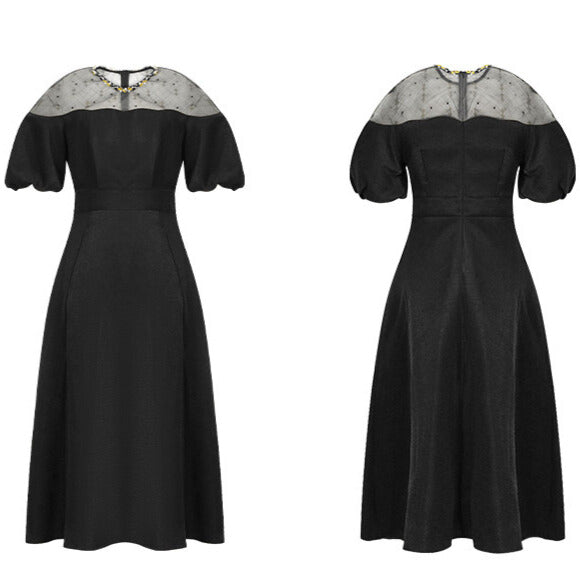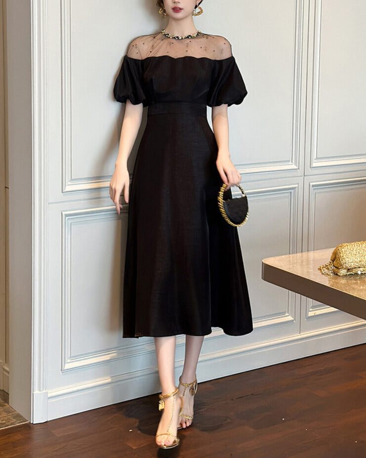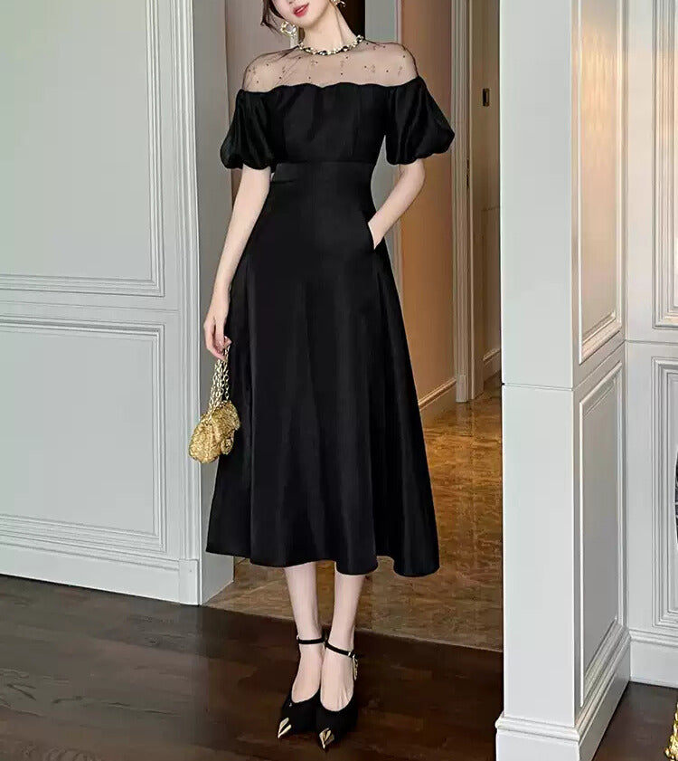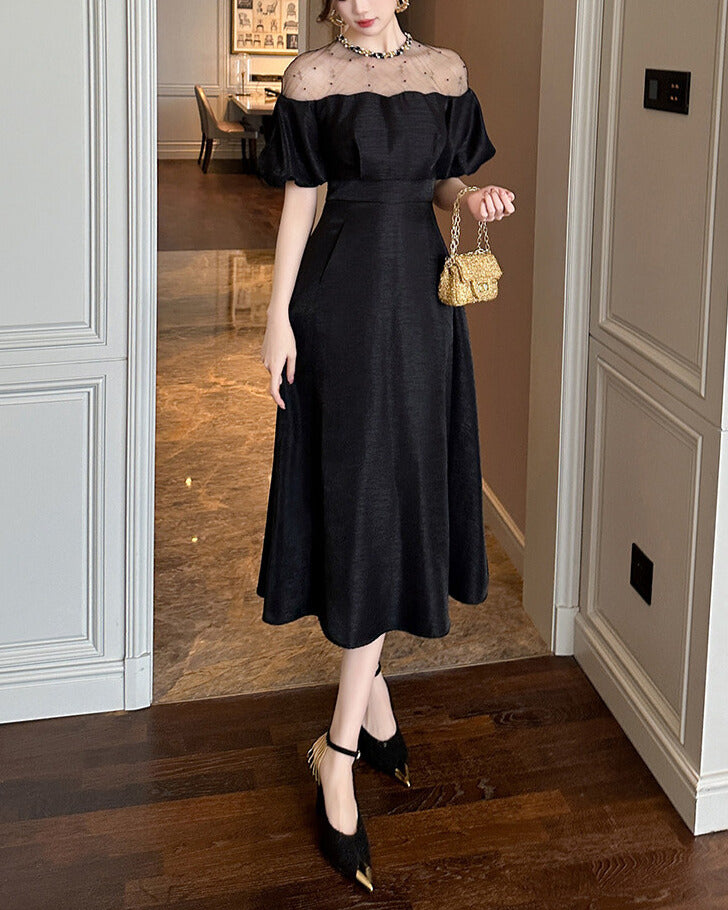 デコルテのシアー切り替えが、抜け感と品を同時に叶えてくれる一着。