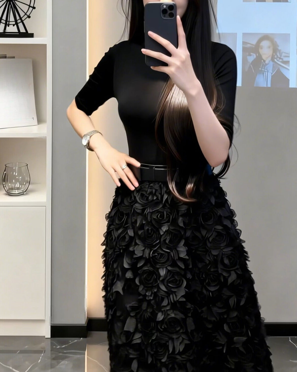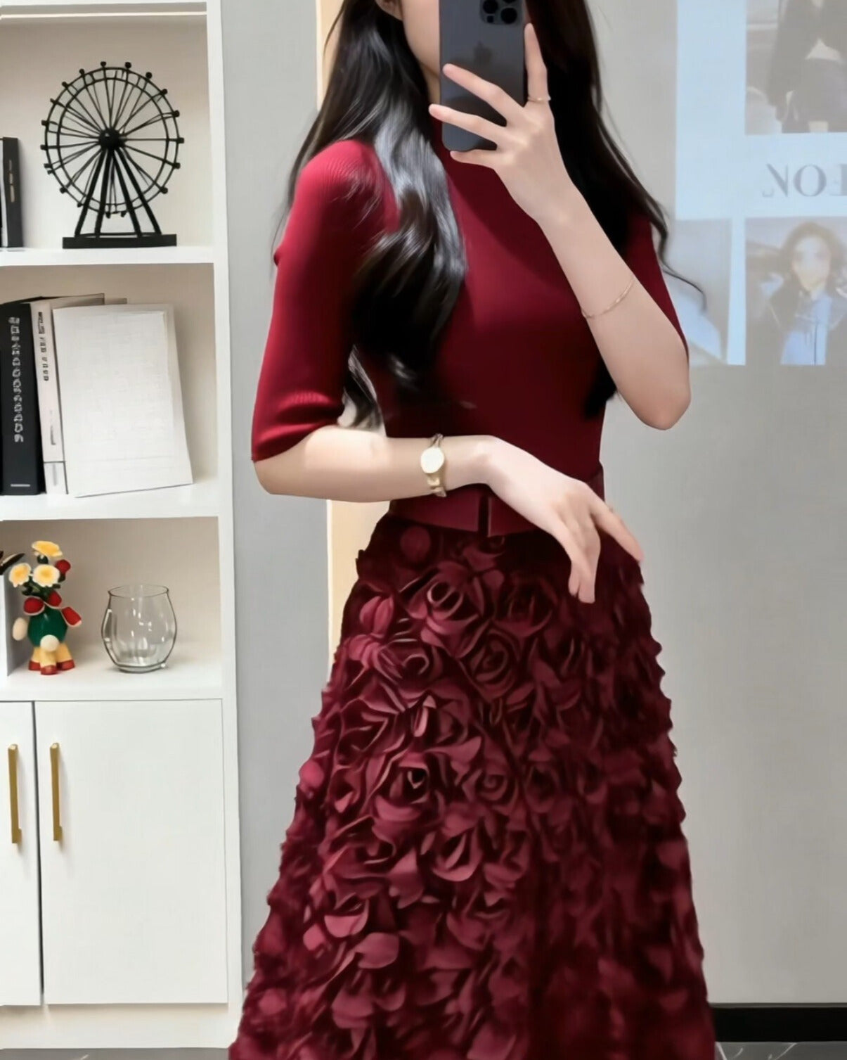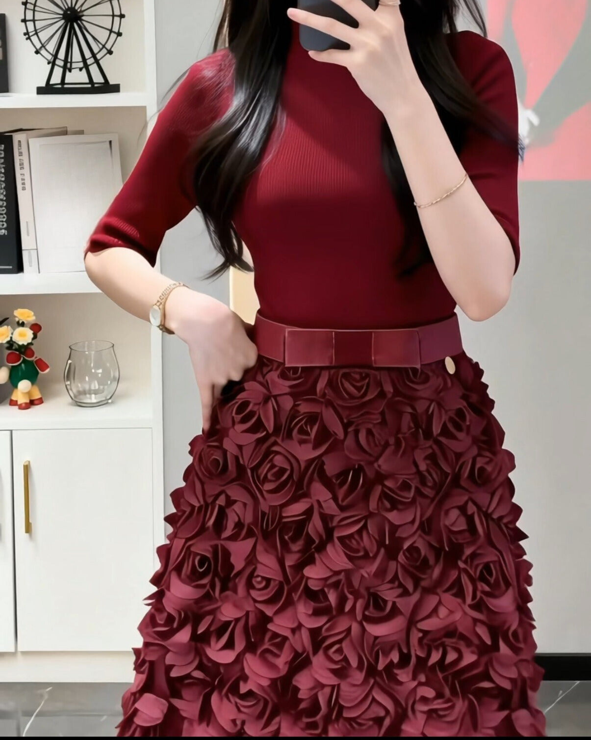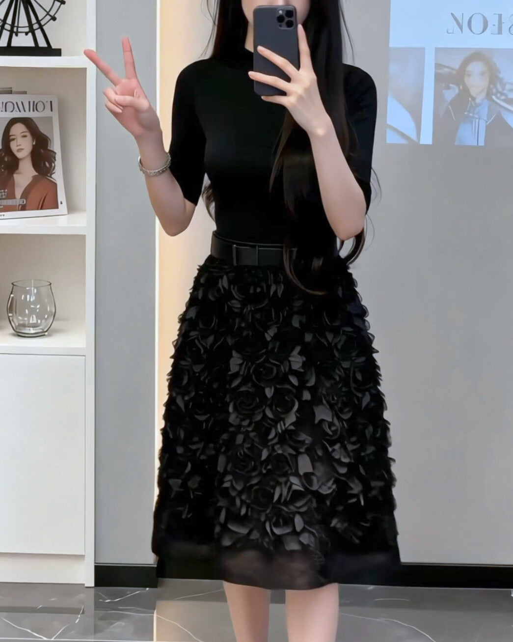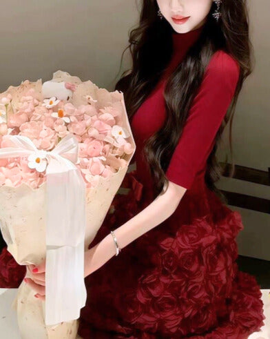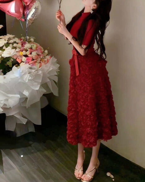 上半身はすっきり大人っぽく、スカートは立体フラワーで視線を奪うデザイン。